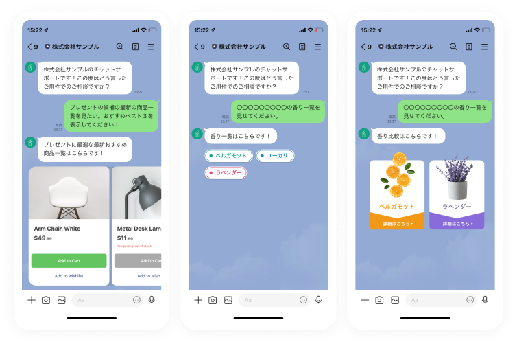既存のanybotのチャットボットに組み込めるため、LINEのチャットボットでよく見かけるカルーセルや、リッチメッセージ、フレックスメッセージ、クイックリプライなども利用可能です。(anybot本体の機能を利用する必要があります)